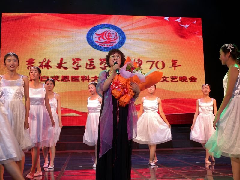 晚会还邀请原白求恩医科大学优秀校友尤红来到师生中间,演唱歌曲《我和校友有个约定》,为母校祝寿,她十分激动地说:“我代表所有的校友感谢母校,是母校培育了我们,给我们关爱,让我们成长!”她饱含深情地朗诵了自己创作的散文诗,赢得了全场热烈的掌声。